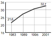 ... désertent la vie publique... Evolution du taux d'abstention électorale (Elections municipales, (1°t), en % d'après Sofrès 2001 et Min. de l'intérieur, 2001) |